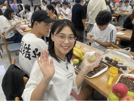 糕点师傅指导师生们亲手制作中秋月饼。在等待月饼烘焙的过程中,师生们自己动手,做出一个个造型独特的灯笼,为节日增加一份趣味。