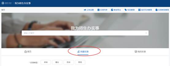 “我为师生办实事”平台根据不同的服务对象和主题,为全校师生提供“咨询”“建议”“投诉”和“表扬”四种反馈类型服务。登录校主页一站式服务大厅或手机客户端“我i南阳理工学院”点击“我为师生办实事”标识,就可以把你的诉求反映给相关部门。届时,我们将用一双“善于发现的眼睛”,一对“善于倾听的耳朵”,及时为您排忧解难,解决师生心中急、难、愁、盼的问题,切实为师生办实事、办难事、办好事。