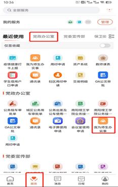 2.输入账号和密码,登录APP后在页面下端点击“服务”页面,在服务页面内找到“我为师生办实事”服务,点击“我要反馈”即可。