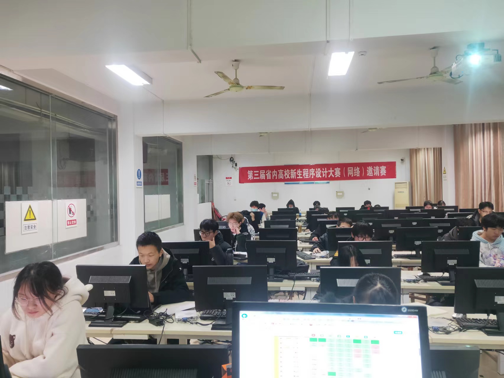 此次大赛面向省内开设有计算机程序设计课程的各高校2022级新生,决赛采用线上加线下的方式进行,我校部分学生在校内机房参加现场决赛,省内其余高校参赛人员通过竞赛网站与现场决赛同步进行,为遵循公平公正的原则,大赛招募了志愿者负责赛场监督工作,同时比赛采用系统判题,动态更新排名,所有学生都可实时查看排行榜。