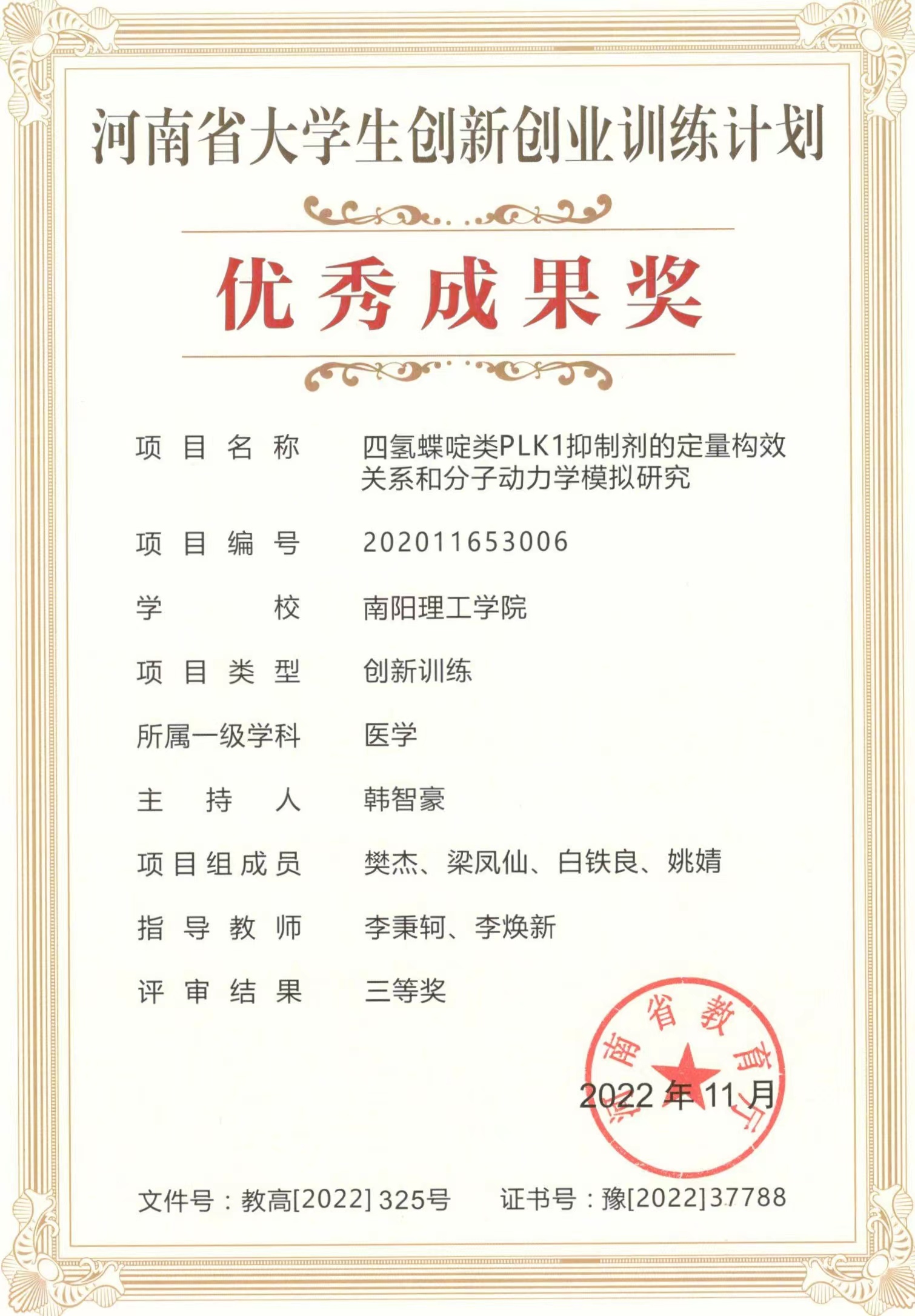 本网讯(记者/杨丹丹)日前,河南省教育厅下发2021年度大学生创新创业训练计划优秀成果奖证书,我校《四氢碟啶类PLK1抑制剂的定量构效关系和分子动力学模拟研究》和《细胞壁结构变化在豫西南寺庙建筑材质研究上的应用及修缮设计》两个项目获得优秀成果奖,充分展示我校近年来在学生创新创业能力培养方面的成效。
