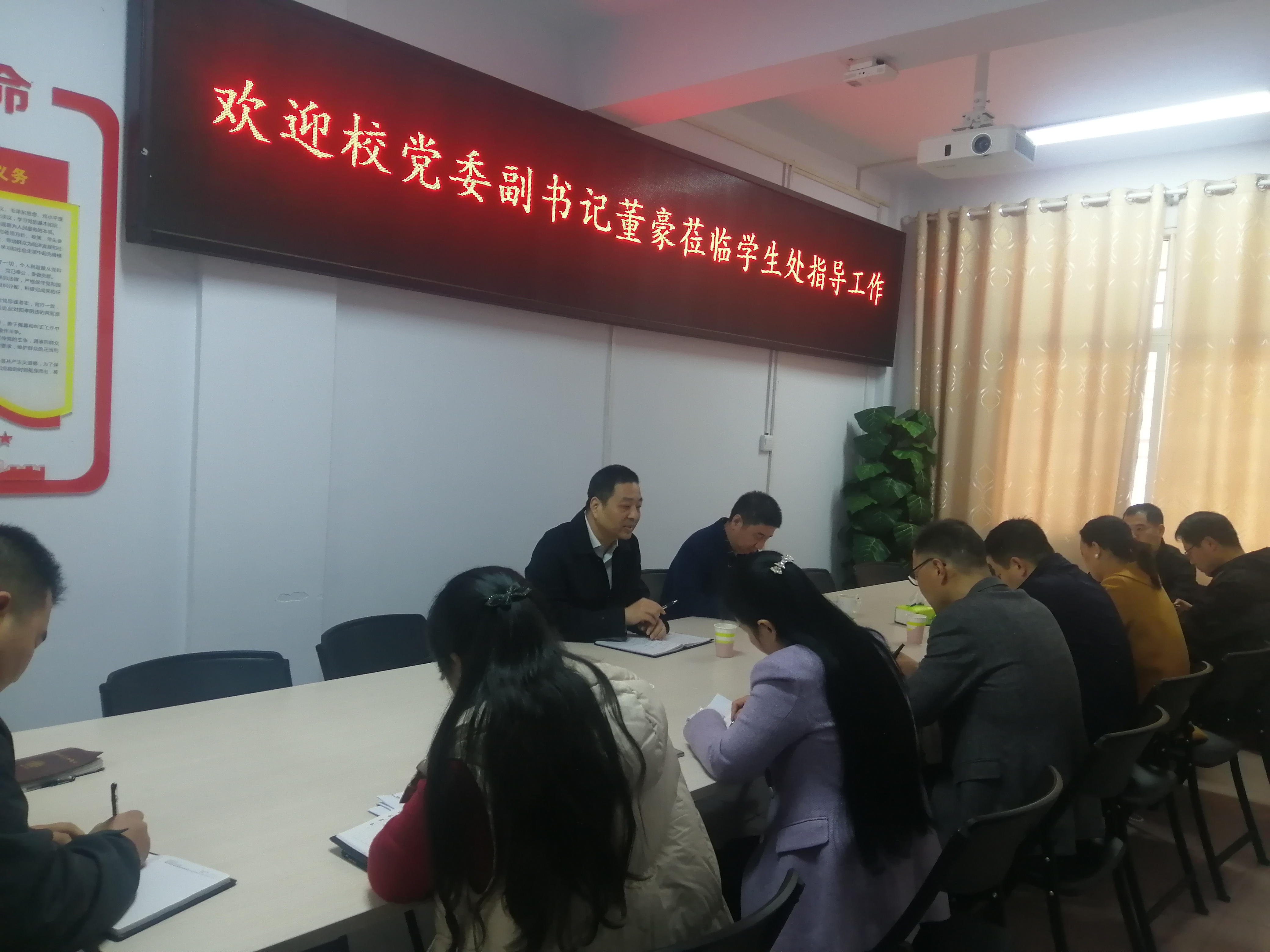 董豪对学生处的工作给予肯定,对现阶段学生处的重点、难点工作进行深入分析、指导,要求直面工作重难点,扎实做好调研,完善工作预案,确保各项工作圆满完成。一是按计划落实好学生常规管理,抓在经常、融入日常、做在平常,特别是全国两会等重要时间节点,守好安全稳定底线。二是紧盯目标任务,着眼长远发展,压紧压实征兵工作责任,指导教学院针对性的开展宣传动员,强化督查督导,全力完成大学生征集硬性指标。三是牵住队伍建设这个“牛鼻子”,落实好辅导员队伍“六个平台”建设,在选配管理、教育培训、能力提升和待遇保障上下功夫。四是提前谋划,积极做好全省“诚信校园行”学生资助知识大赛总决赛筹备工作,确保赛事顺利进行,以此为契机助推我校资助育人工作再上新台阶。(校对/胡玲 审核/路瑞峰)