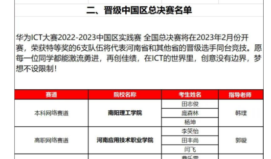 本网讯(特约记者/韩璞)近日,我校信息工程学院田志俊、庞森林和杨坤三名学生经过校级初赛和省级决赛层层选拔后,成功受邀参加华为ICT大赛2022-2023中国区实践赛总决赛。