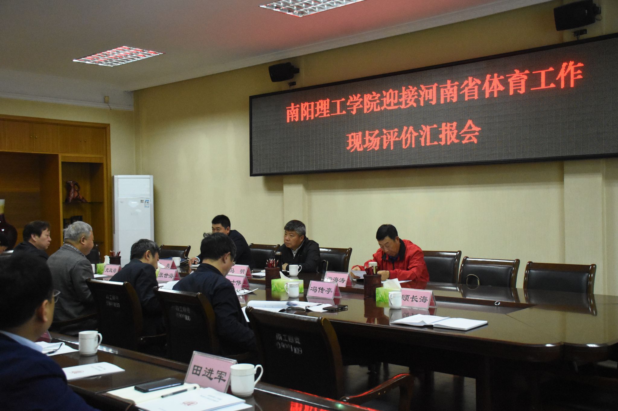 本网讯 (特约记者/徐驰)4月13日,省教育厅高校体育评估专家小组组长马明一行三人莅临我校进行现场评价,校长安士伟、副校长张世海出席汇报会,教学评估与质量监控中心、党政办公室、党委宣传部、人事处、教务处、体育教学部、学生处、校团委、后勤管理服务中心等单位负责人参加汇报会。