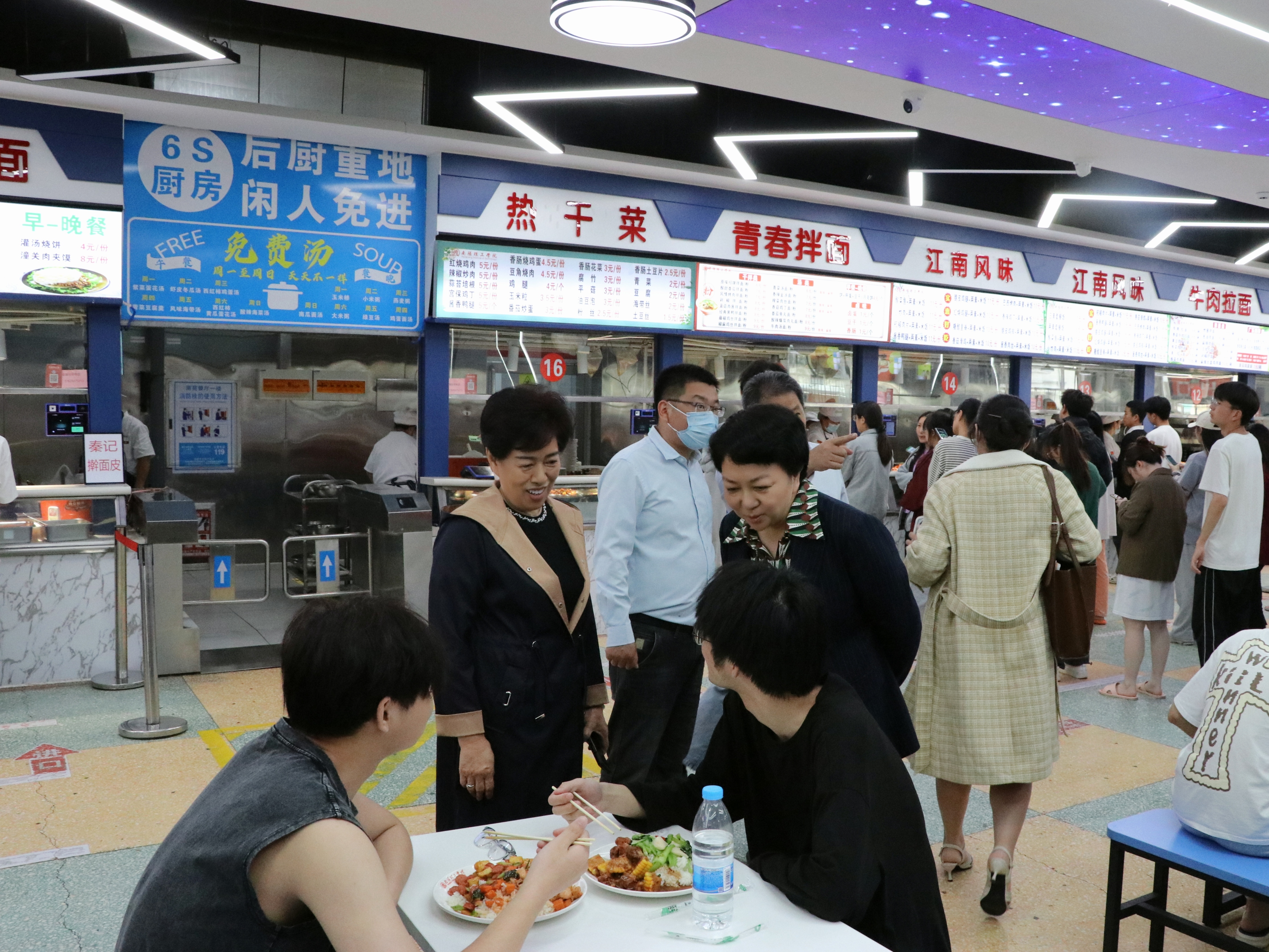 在南苑餐厅,刘荣英详细了解餐厅当前供餐种类、价位、分量和特色餐食情况,征询就餐同学对餐饮服务的意见和建议。她表示,餐饮服务保障工作事关广大师生切身利益,要稳定饭菜价格,丰富菜品种类,努力为师生提供安全、便利的校园生活服务。(校对/胡冰 审核/张良 责编/肖邓华)