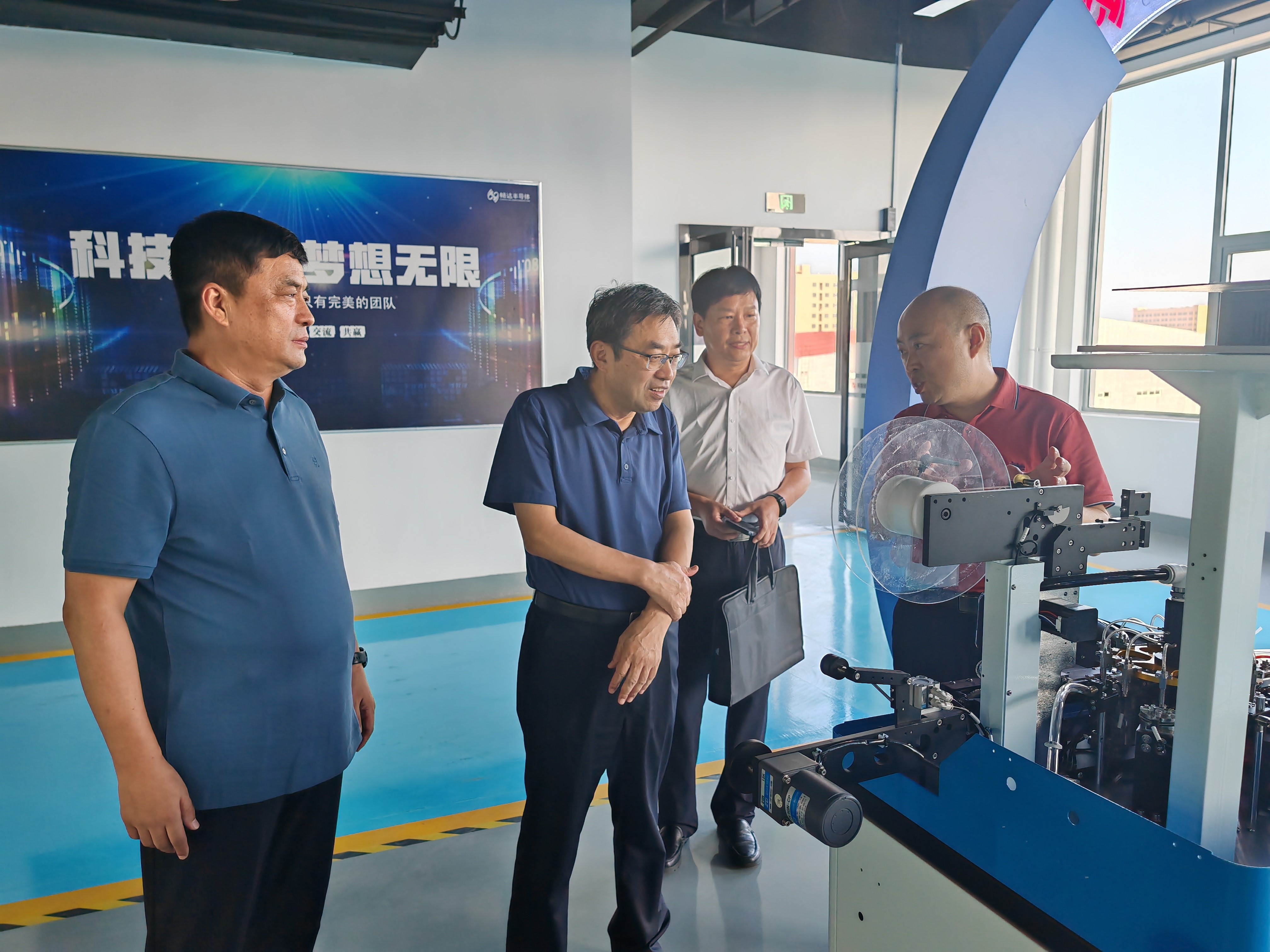 本网讯(特约记者/赵彦普)8月3日下午,校长安士伟带领校地合作管理与服务中心相关负责人赴河南畅达半导体有限公司开展走访调研,洽谈校企合作。南阳经济技术开发区管委会副主任杨虎,河南畅达半导体有限公司董事长赵玉涛等相关负责人陪同调研。
