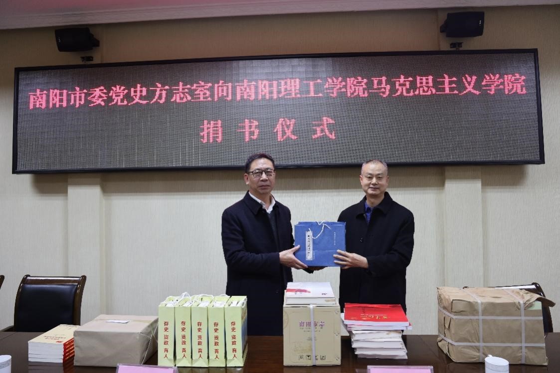 本网讯(特约记者/岳红伟)12月6日,南阳市委党史和地方史志研究室向马克思主义学院捐赠《中国共产党在南阳的光辉历程(1921-2021)》《中国共产党南阳历史》《南阳市志》等书籍共10余种近百本。