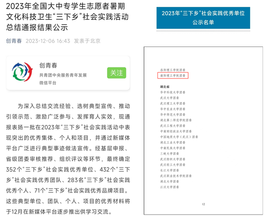 本网讯(特约记者/王文博)近日,共青团中央下发2023年全国大中专学生志愿者暑期文化科技卫生“三下乡”社会实践活动总结通报结果。我校荣获全国大中专学生志愿者暑期文化科技卫生“三下乡”社会实践活动优秀单位。