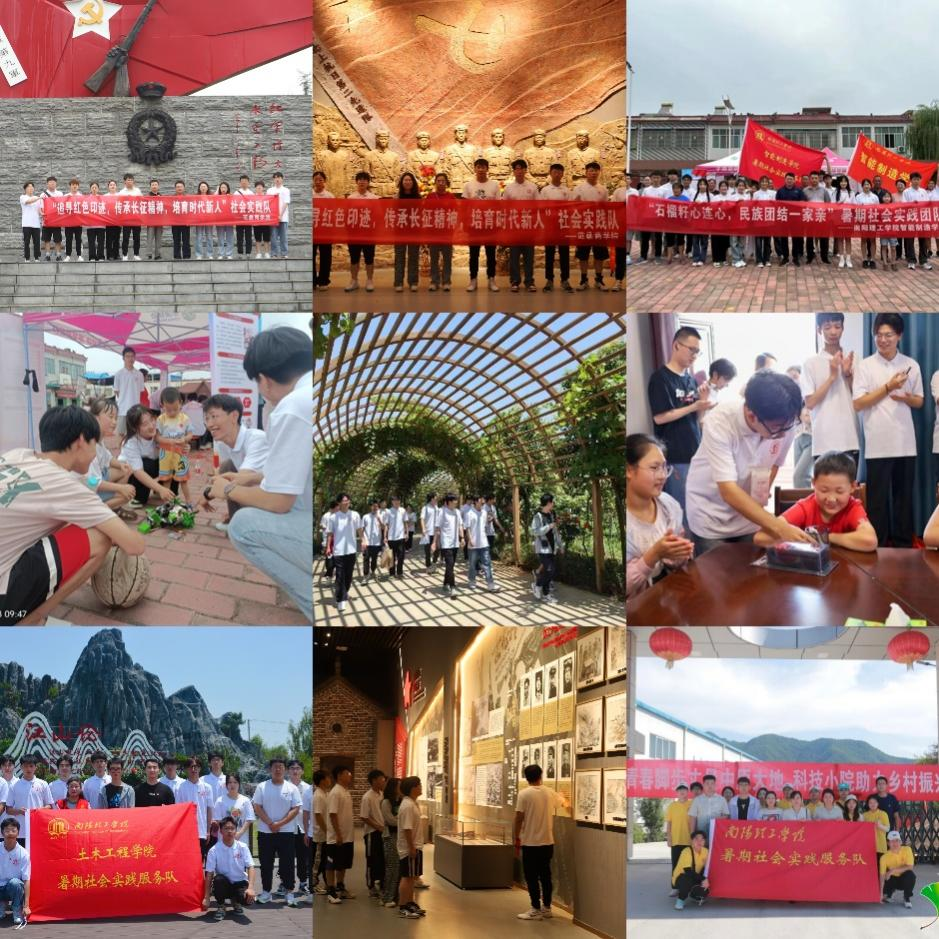 2023年,校团委根据团中央、团省委有关工作部署,在校党委的领导下以“学习二十大 永远跟党走 奋进新征程”为主题,精心组建44支社会实践专项团队,8533名团员青年围绕乡村振兴、南水北调、沿黄河流域、弘扬仲景文化、关爱留守儿童等11个方面开展一系列主题鲜明、形式新颖、内容丰富的暑期社会实践活动。其中《“石榴籽心连心,民族团结一家亲”实践队》、《奋楫笃行扎根科技小院,踵事增华助力乡村振兴实践队》获团中央立项,《南工推普助力乡村振兴,青年勇立潮头肩挑重任》获团中央、教育部立项,《“艺绘九里山,献礼二十大”美丽乡村建设暑期社会实践队》获团省委立项。