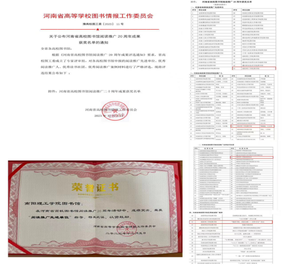 本网讯(特约记者/毛懋)近日,河南省高等学校图书情报工作委员会公布《河南省高校图书馆阅读推广20周年成果获奖名单》,我校图书馆荣获“河南省高校阅读推广先进单位”,我校读者协会荣获“河南省高校图书馆阅读推广优秀读书社团”,“畅游书海,求索无限——书库寻宝”活动荣获“河南省高校图书馆优秀阅读推广案例”,邹满丽、王文杰同志荣获“河南省高校图书馆优秀阅读推广人”。