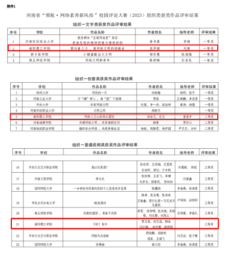 本网讯(记者/刘庚)近日,中共河南省委教育工委办公室、河南省教育厅办公室印发《关于河南省“领航·网络素养新风尚”校园评论大赛(2023)拟获奖作品及名单的公示》,我校共有3件作品获奖。