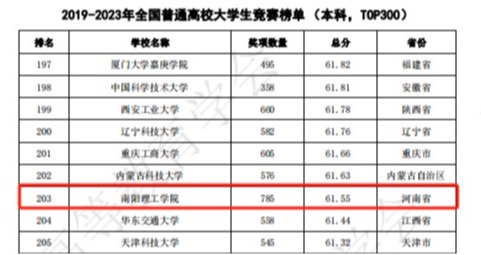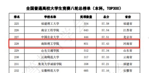 我校在全国普通高校大学生竞赛八轮总榜单中综合排名上升10名,位居228名,河南省第9名。