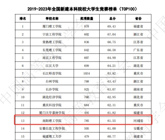 本网讯(特约记者/王闯)3月22日,中国高等教育学会公布《2023全国普通高校大学生竞赛分析报告》,我校在2019-2023年全国普通高校大学生竞赛榜单中综合排名上升17名,位居203名,河南省第8名;在2019-2023年全国新建本科院校大学生竞赛榜单中上升1名,位居13名,河南省第1名。自2019年中国高教学会公布新建本科院校排行榜以来,我校连续5年在河南省新建本科院校中排名第一。