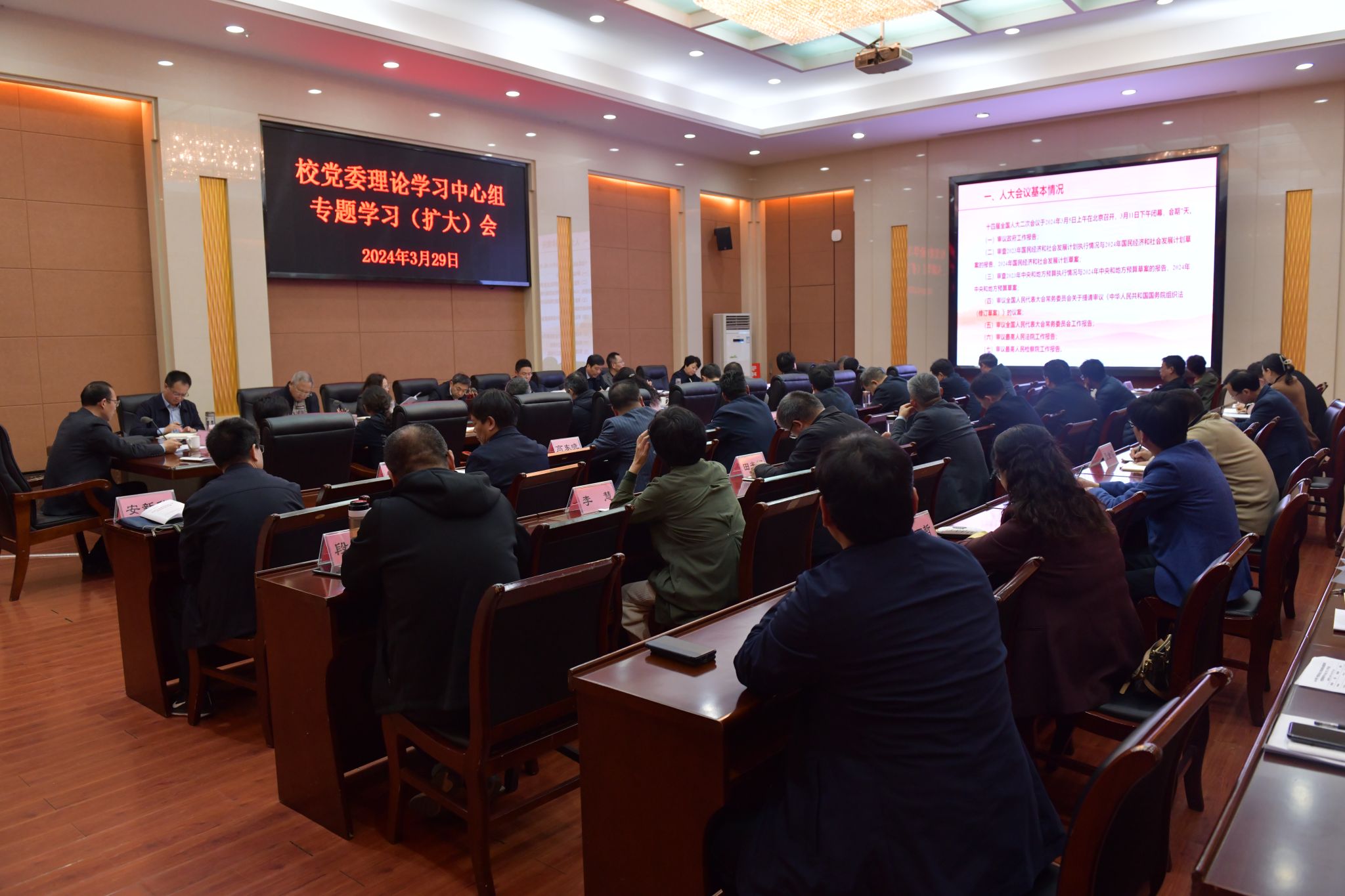 本网讯(记者/王小婉)3月29日下午,校党委书记安士伟主持校党委理论学习中心组专题学习(扩大)会,专题学习习近平总书记在全国两会期间的重要讲话精神和2024年全国两会精神,研究部署我校贯彻落实意见。校党委理论学习中心组成员、部分职能处室负责同志和各直属党组织书记参加。