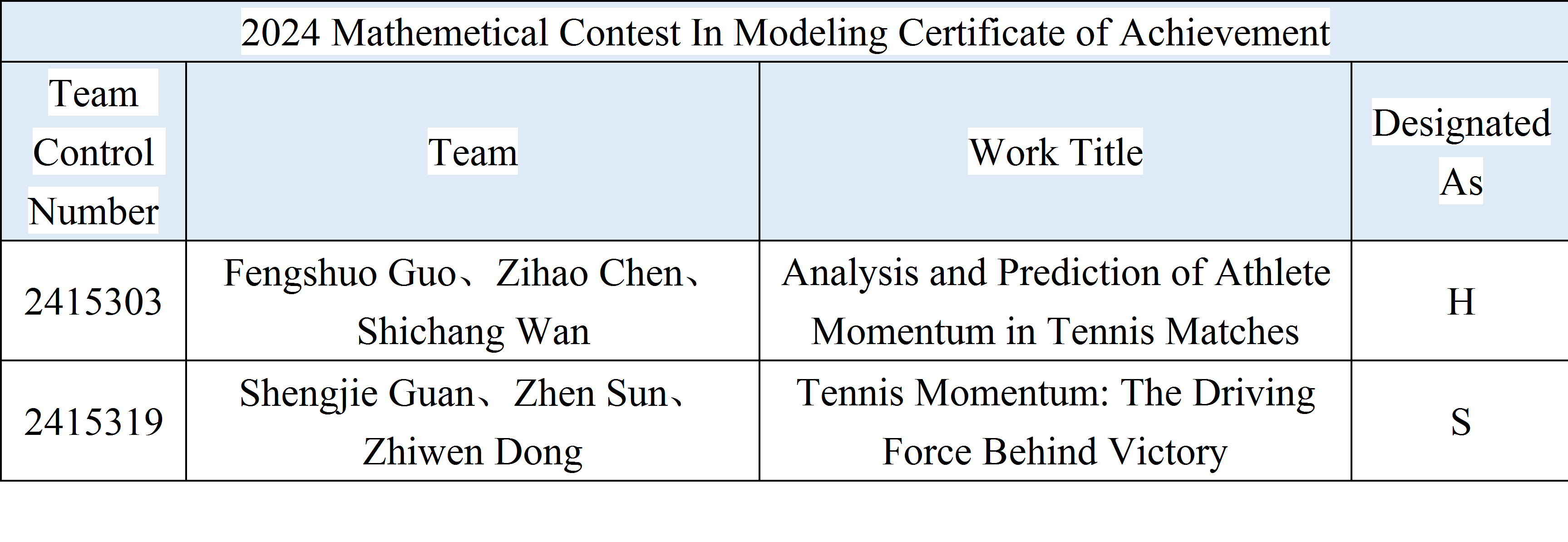 本网讯(特约记者/贾子琪 郭东恩 学生记者/董智文)5月7日,2024年美国大学生数学建模竞赛结果公布,我校两支参赛队伍分别荣获H奖(二等奖)与S奖(参赛奖)。
