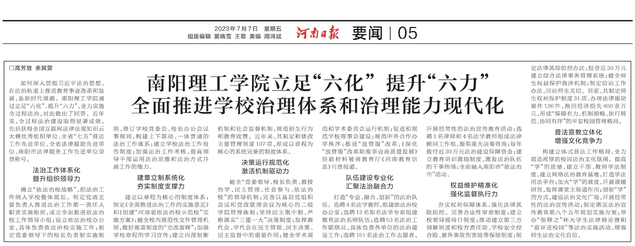 健全以《南阳理工学院章程》为核心的规章制度体系,及时废除、制定、修订各类规章制度343项;完善党委领导下的校长负责制,坚持“党委领导、校长负责、教授治学、民主管理、社会参与、依法治校”领导机制,落实教职工工会和教职工代表大会制度及学生代表大会制度,加强学术委员会建设,学校内部治理结构进一步完善;深入实施依法治校战略,先后荣获全国互联网法律法规知识云大赛优秀组织单位、全省普法工作先进单位、南阳市“七五”普法工作先进集体,“1+N”五维并举主题普法教育活动获全省校园法治文化品牌项目;深入开展数据治理,建立“一站式网上服务大厅”,优化网上办事流程,建成“全域覆盖、全集抽取、全程管理、开放服务、隐私计算”高水平数据治理体系,与市公安局联合成立南阳市网络安全监控预警中心,连年获得省教育系统网络安全和信息化工作先进集体。国家产教融合大楼、东校区及人才公寓先后建成并投入使用;聚焦民生热点,改善社区环境,推广节能减排,先后获批“河南省高校后勤信息化建设先进单位”、全国“公共机构水效领跑者”称号。(校对/鲁静薇 编辑/肖邓华 审核/逯忆)