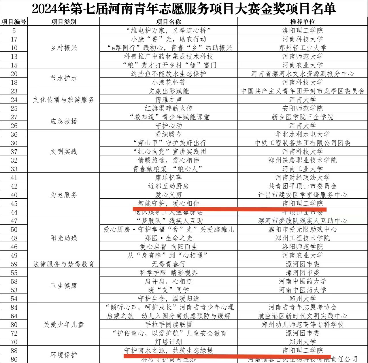 本网讯(特约记者/尹卓然)9月9日,共青团河南省委、省委社会工作部、省民政厅等部门联合举办的第七届河南青年志愿服务项目大赛,我校《智能守护,暖心相伴》和《守护南水之源,共筑生态绿堤》两个项目荣获金奖。