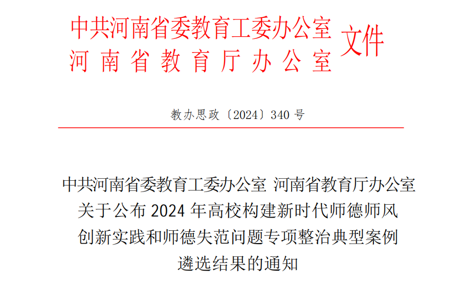 本网讯(特约记者/韦地)近日,中共河南省委教育工委河南省教育厅下发《关于公布2024年高校构建新时代师德师风创新实践和师德失范问题专项整治典型案例遴选结果的通知》,我校范蠡商学院申报的《弘扬教育家精神 锻造高素质教师队伍》获评全省实践案例。