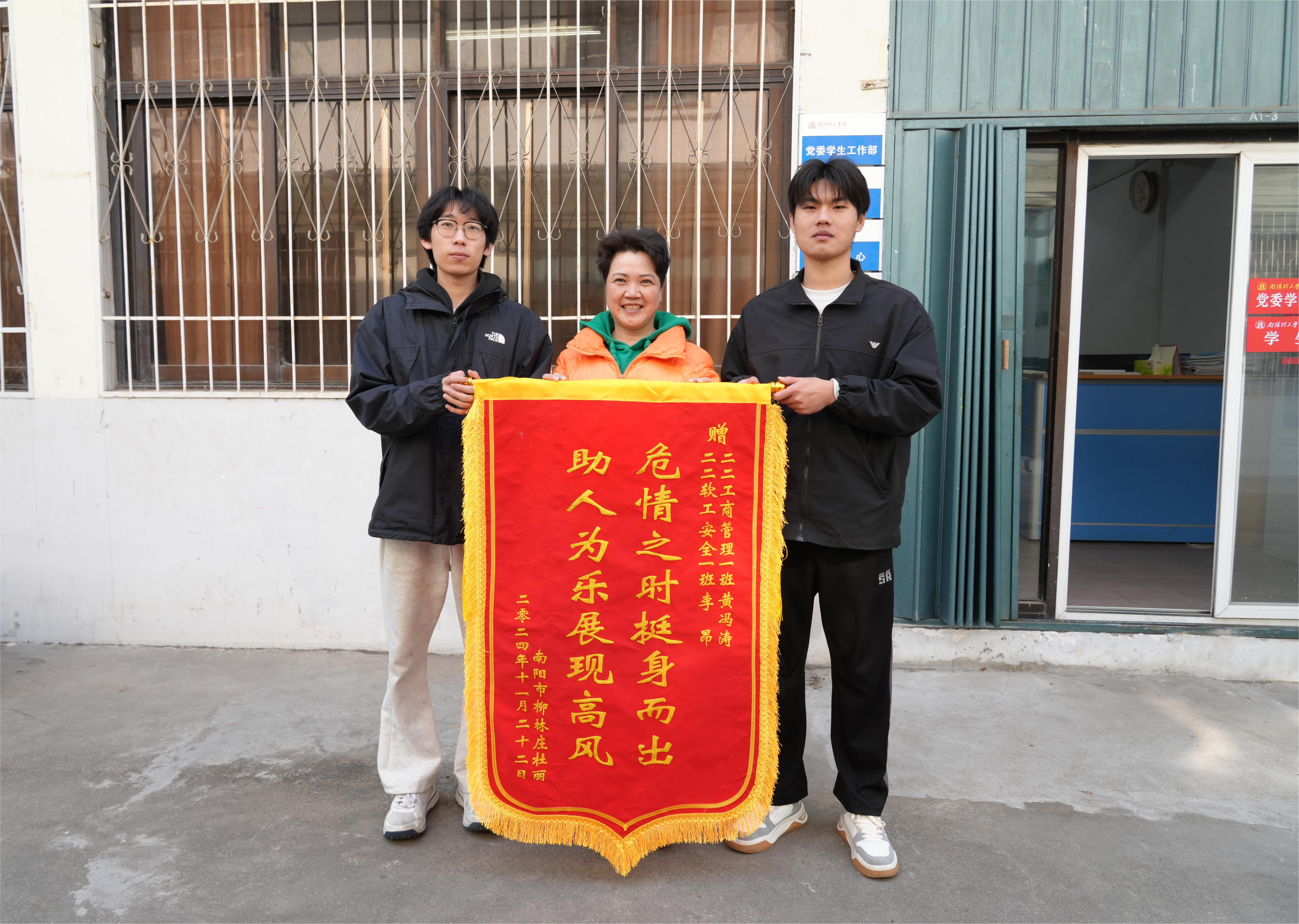 本网讯(记者/肖邓华 鲁静薇 学生记者/徐爱婷)“在这个社会,面对老人摔倒,很多人或许会因担忧而犹豫,但你们的勇敢与善良如同冬日暖阳,温暖人心。感谢南阳理工学院培养出如此优秀的学生,这样的正能量行为让我们对社会充满了希望。”11月21日下午,在一场简单而温馨的仪式上,老人家属亲手将一面锦旗赠予两位同学,对他们的善行给予了高度评价。