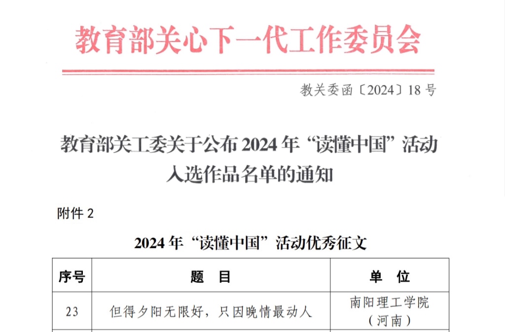 本网讯(特约记者/黄晨)近日,我校在教育部举办的2024年“读懂中国”活动中获优秀征文1项,在省教育厅举办的高校“读懂中国”活动中,参赛的五个作品全部获奖,其中特等奖3项、一等奖2项。