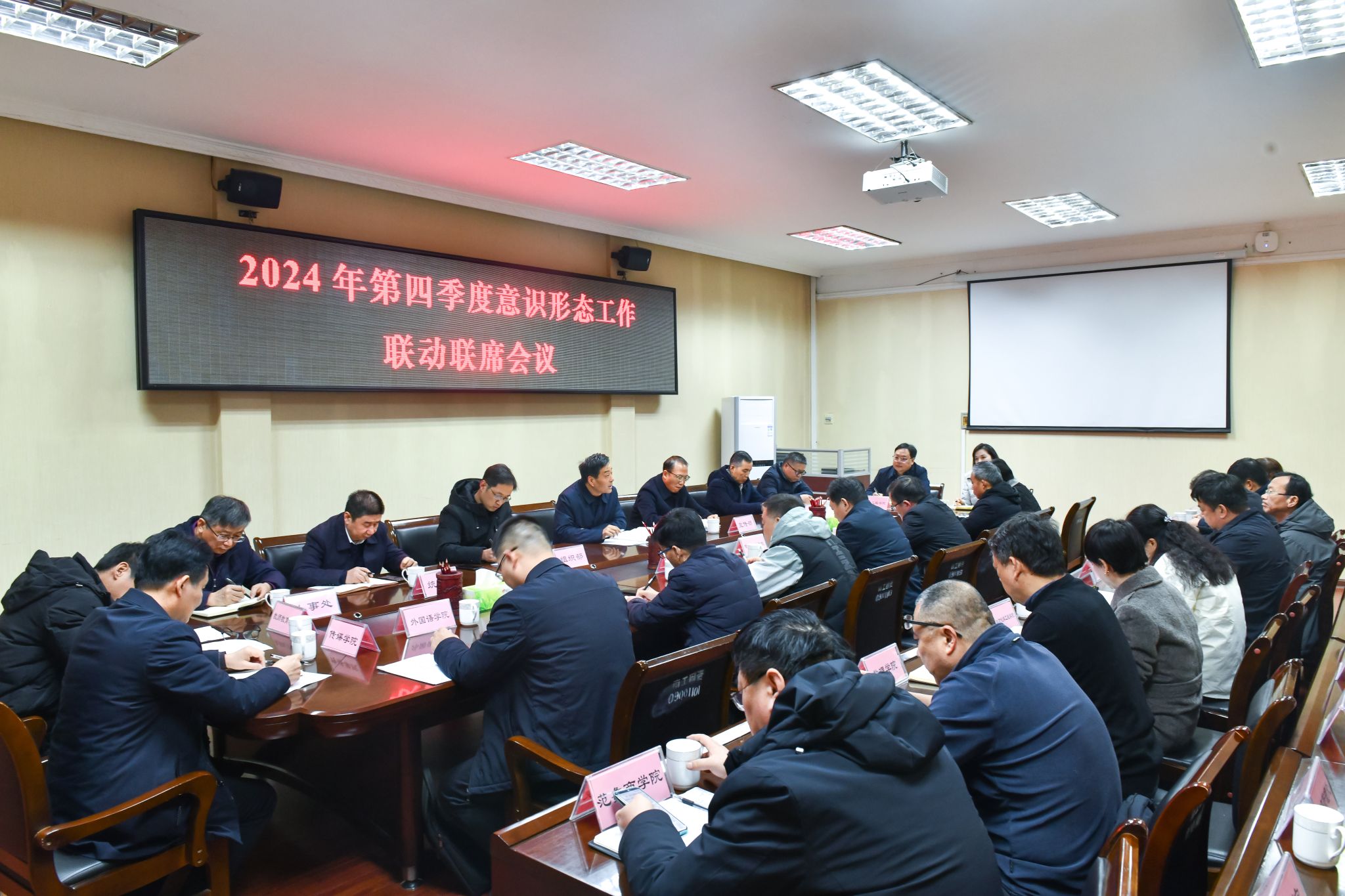 本网讯(记者/任寰)12月26日下午,我校召开2024年第四季度意识形态工作联动联席会议,会商研判部署学校意识形态工作。校党委副书记、工会主席董豪主持并讲话,各直属党组织书记、学校意识形态工作领导小组成员单位主要负责同志参加。