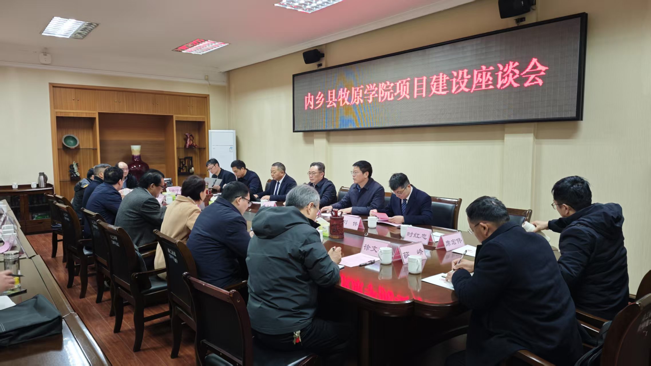 内乡县人民政府相关负责同志分别介绍牧原学院项目征地情况、项目建设保障情况及下一步工作设想,牧原集团有关负责人介绍牧原学院建设目的与企业发展需求,南阳理工学院相关部门人员介绍新校区建设、学校办学成本、办学条件等政策背景、人才培养需求与学校发展现状。