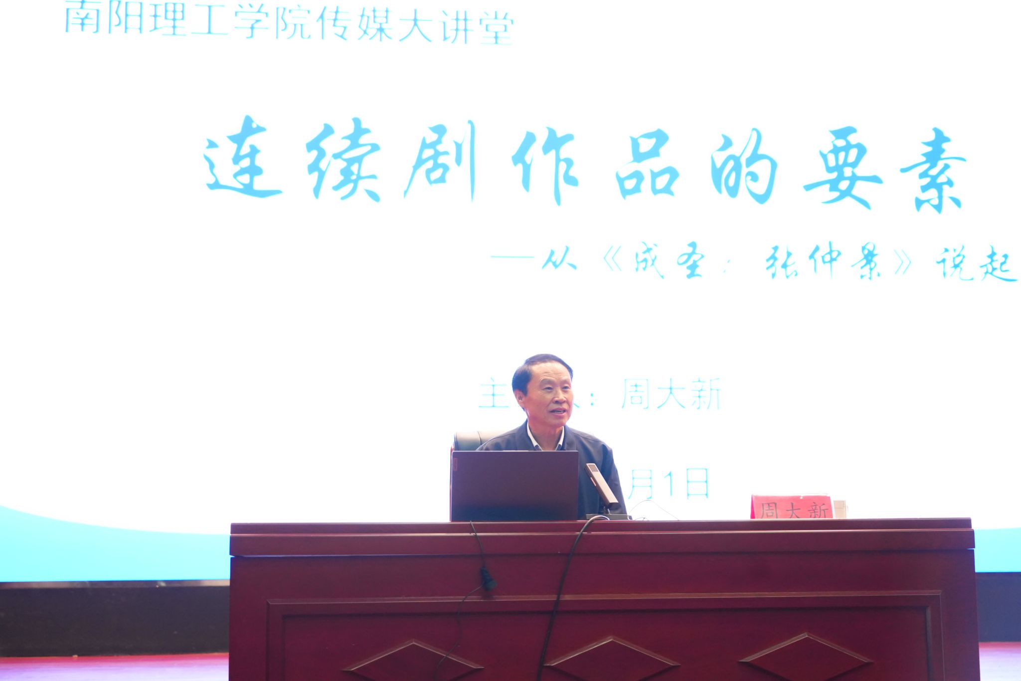 讲座中,周大新结合新作《成圣:张仲景》的创作经历,为大家详细讲解历史人物传记类剧本创作需要注意的主要人物设计、故事设定、场次与画面设置三个方面的要点。