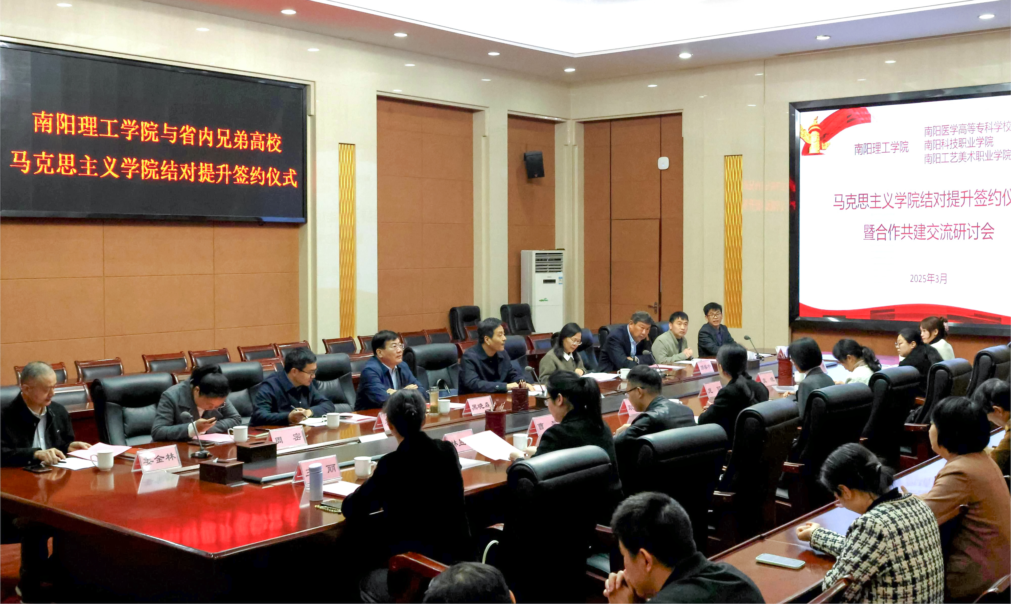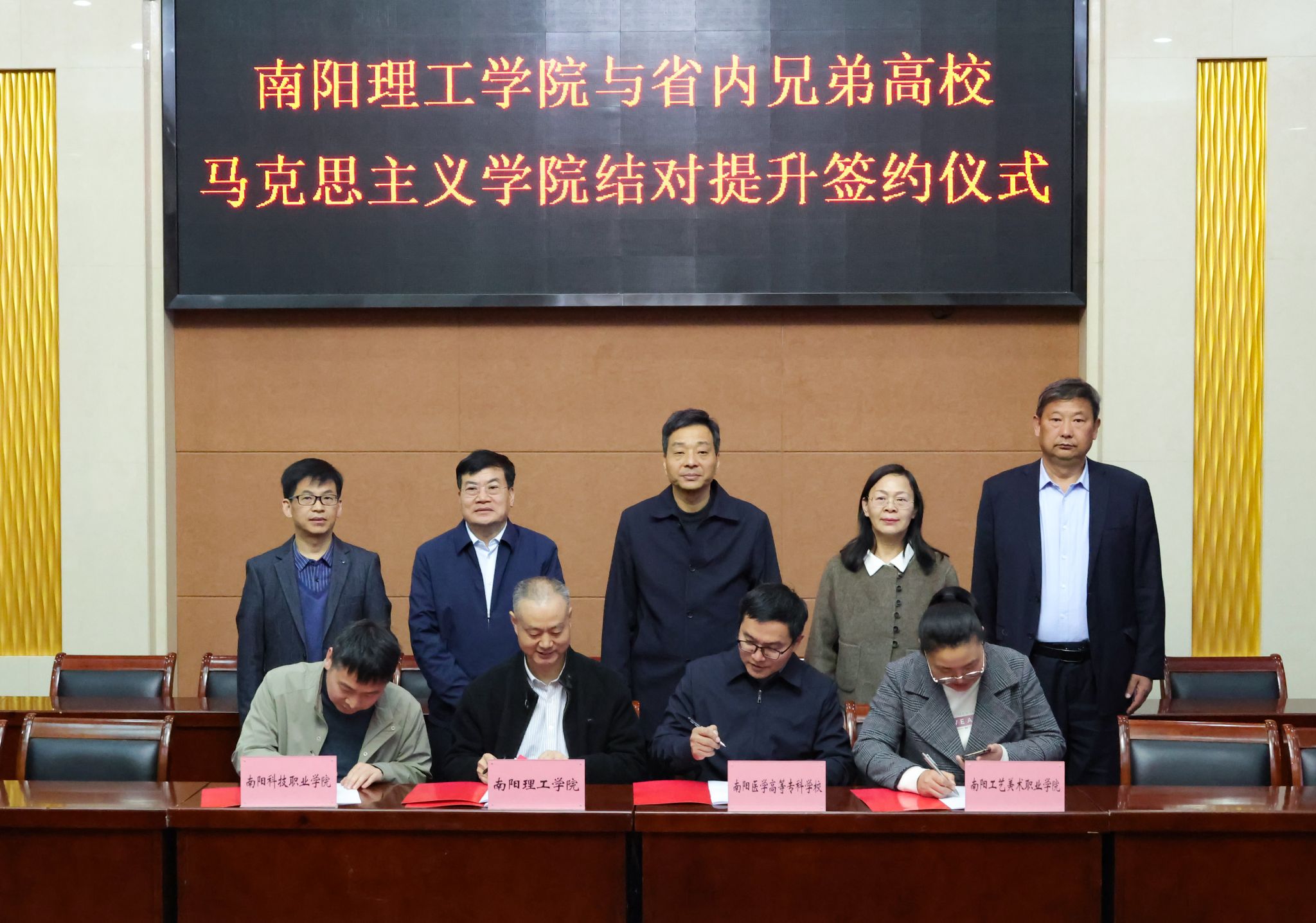 四校马克思主义学院负责人共同签署结对提升协议,南阳理工学院马克思主义学院负责同志作表态发言,承诺将以高度的责任感和使命感落实共建任务,确保两年建设期内各项合作目标高质量完成。