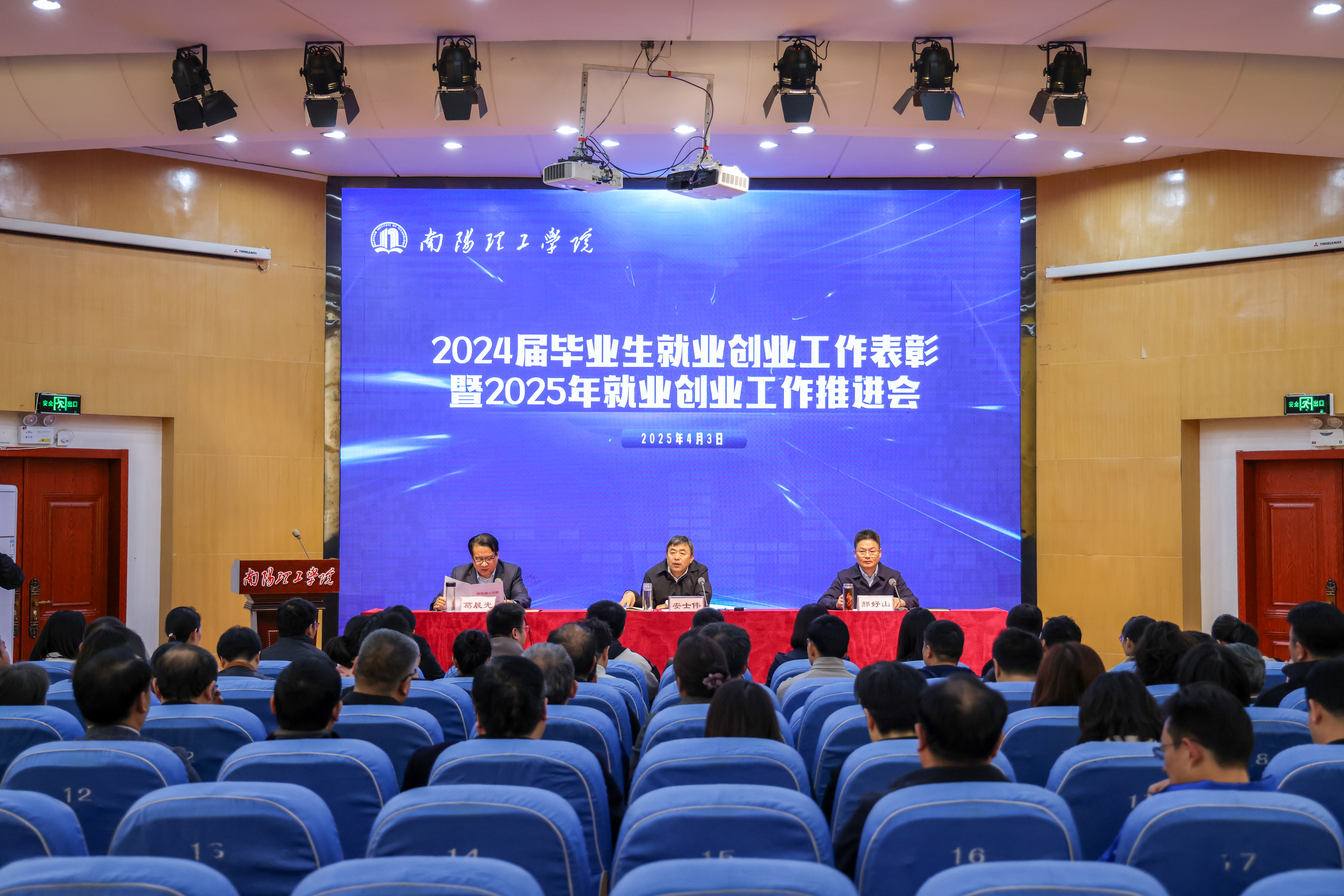 本网讯(记者/程涛)4月3日,我校在第二学术报告厅召开2024届毕业生就业创业工作表彰暨2025年毕业生就业创业工作推进会。校党委书记安士伟主持会议,校长郝好山发表讲话。副校长葛晨光出席会议,各教学院党委书记、院长、相关教师及招生就业处全体人员参加会议。