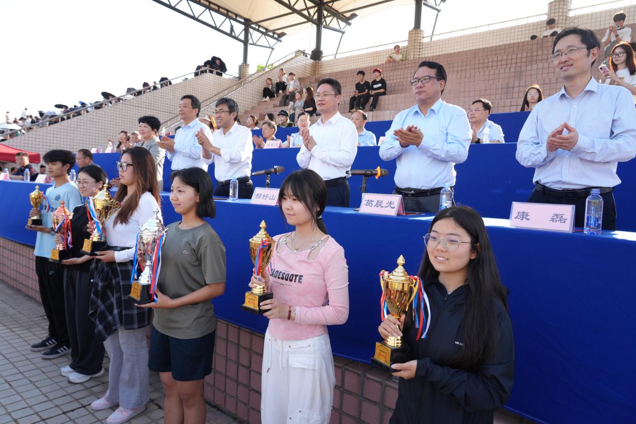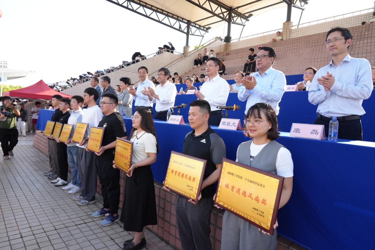 校领导为获奖师生颁发团体奖项。计算机与软件学院、智能制造学院、生物与化学工程学院分别获学生男子团体冠、亚、季军;计算机与软件学院、范蠡商学院、建筑学院分别获学生女子团体冠、亚、季军;计算机与软件学院、范蠡商学院、建筑学院分别获学生团体冠、亚、季军;信息工程学院分工会、张仲景国医国药学院分工会、智能制造学院分工会分别获教工团体冠、亚、季军;传媒学院、土木工程学院、数字媒体与艺术设计学院、范蠡商学院、张仲景国医国药学院、计算机与软件学院、外国语学院、信息工程学院获体育道德风尚奖。