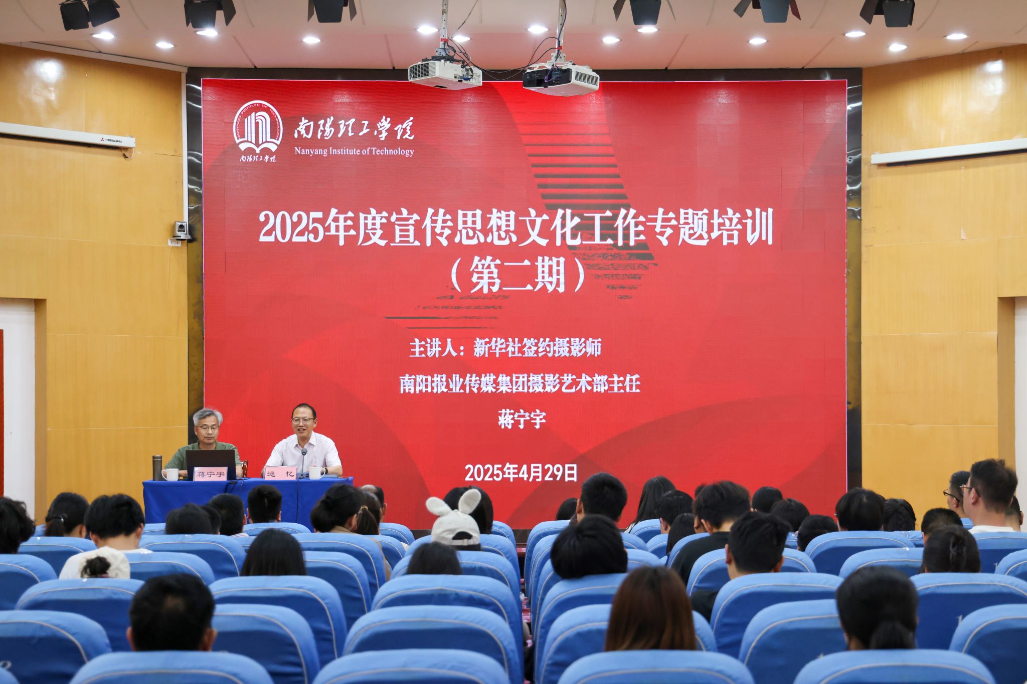 本网讯(记者/鲁静薇 学生记者/韩芳)4月29日下午,南阳理工学院在领创空间二楼报告厅举办2025年宣传思想文化工作专题培训(第二期)。讲座由新华社签约摄影师、南阳报业传媒集团摄影艺术部主任蒋宁宇主讲。党委宣传部部长逯忆主持讲座,党委宣传部全体人员、各学院相关负责人及师生代表近200人参加培训。