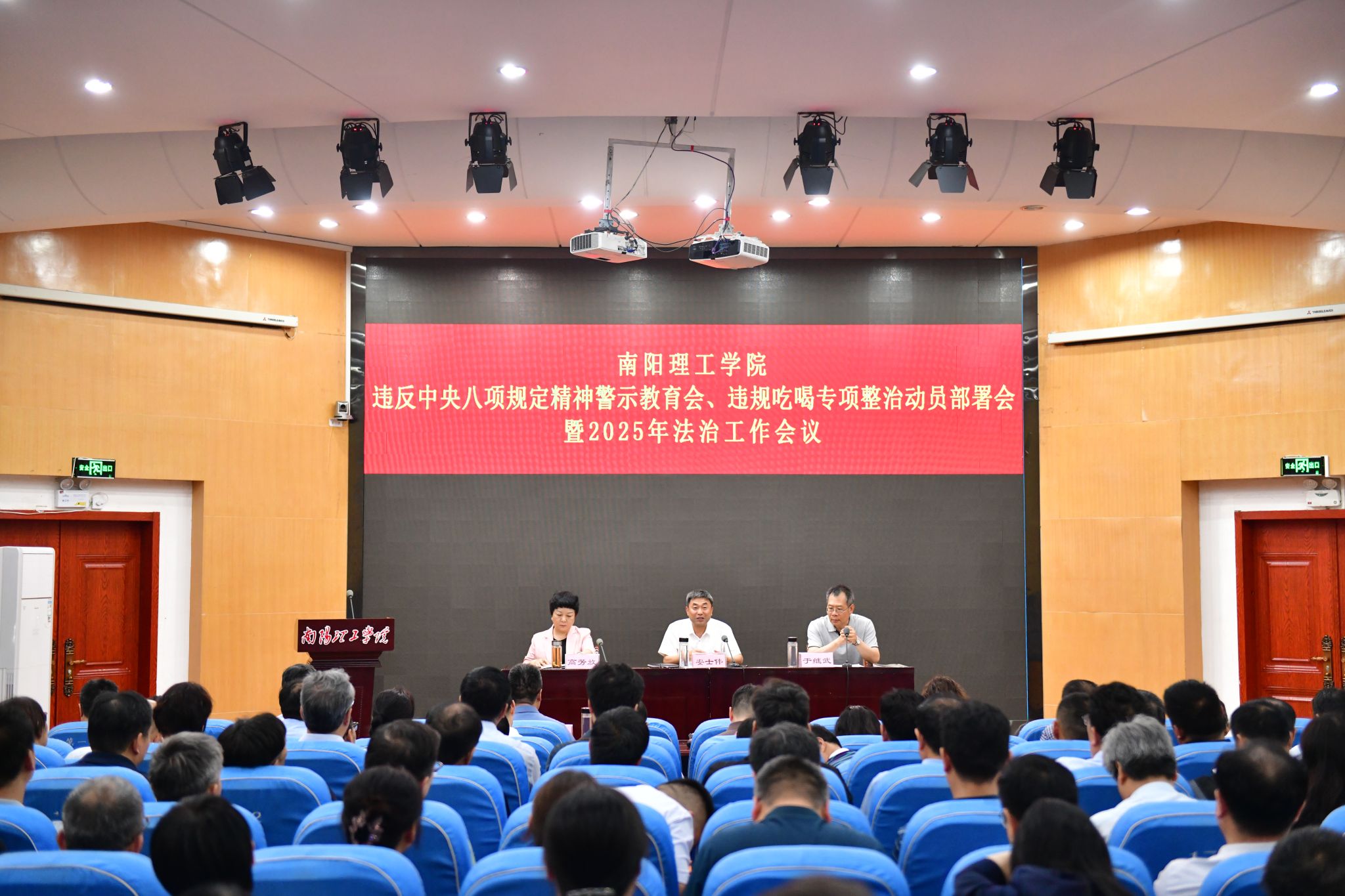 本网讯(特约记者/李萌)5月22日下午,南阳理工学院在第二报告厅召开违反中央八项规定精神警示教育会、违规吃喝专项整治动员部署会暨2025年法治工作会议。校党委书记安士伟主持会议并讲话,校纪委书记、监察专员于继武传达上级通报及文件精神,副校长高芳放部署法治工作,全体在校校领导、中层干部、法律顾问、依法治校办公室人员及各单位法治联络员参加会议。
