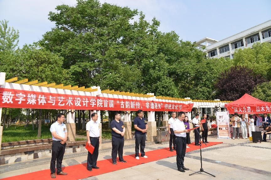 本网讯(特约记者/张天赐)5月24日,数字媒体与艺术设计学院首届“古韵新传,非遗逐光”传统文化节启动仪式在齐贤广场举行。副校长蔡广宇出席活动并致辞,非遗传承人代表,党委宣传部、学生处、团委等单位负责人,数字媒体与艺术设计学院师生代表参加活动。
