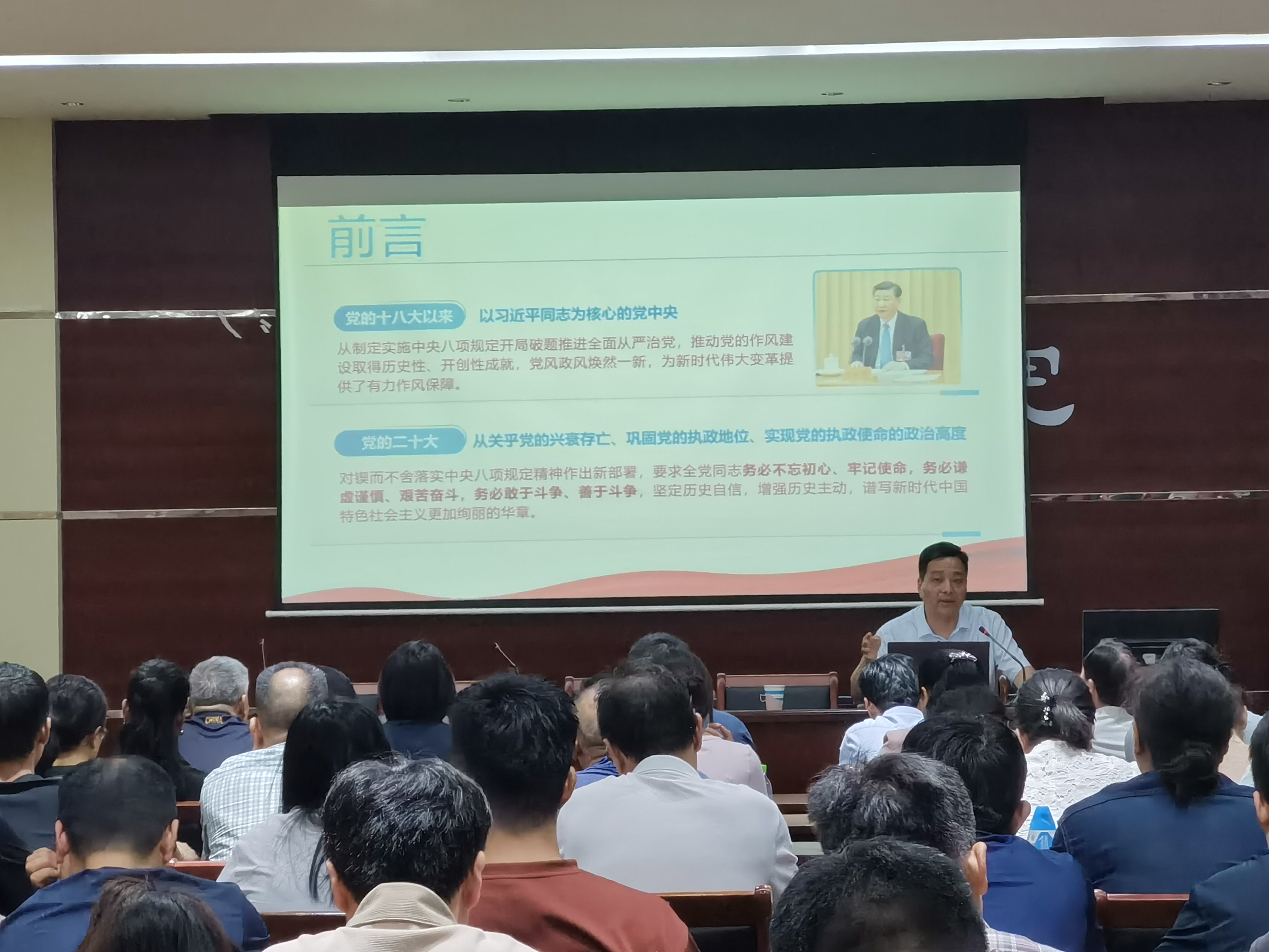董豪紧扣“深入学习贯彻中央八项规定精神”主题,从理论、历史、实践三个维度展开阐述。他引述习近平总书记“党的作风是党的形象,是观察党群干群关系、人心向背的晴雨表”等重要论述,讲述作风建设关乎党的生死存亡的重大政治意义;在历史演进部分,通过梳理党在不同历史时期作风建设的经验传承,揭示作风建设永远在路上的时代内涵;在政策解读环节,结合典型案例详解中央八项规定精神的核心要义,强调要始终把纪律规矩挺在前面。