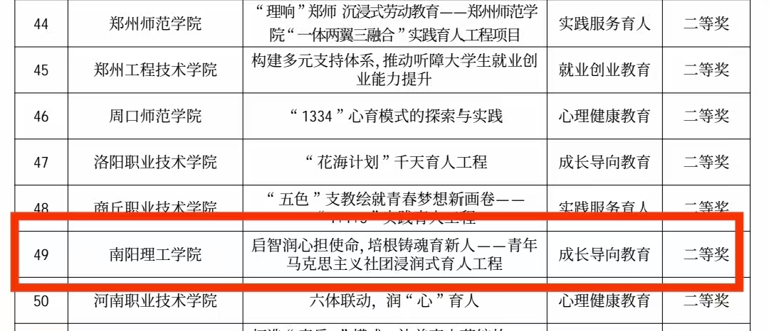 长期以来,南阳理工学院高度重视思想政治教育工作,积极探索具有时代特征、青年特点、学校特色的育人路径,努力构建协同联动、融合贯通的“大思政”工作格局。下一步,学校将继续以“项目育人”为抓手,强化品牌建设,丰富育人内涵,不断提升学生工作的时代性、系统性和实效性,推动思想政治工作高质量发展,培养更多堪当民族复兴重任的时代新人。(校对/李冬生 审核/闫合占 编辑/王小婉 终审/肖邓华)