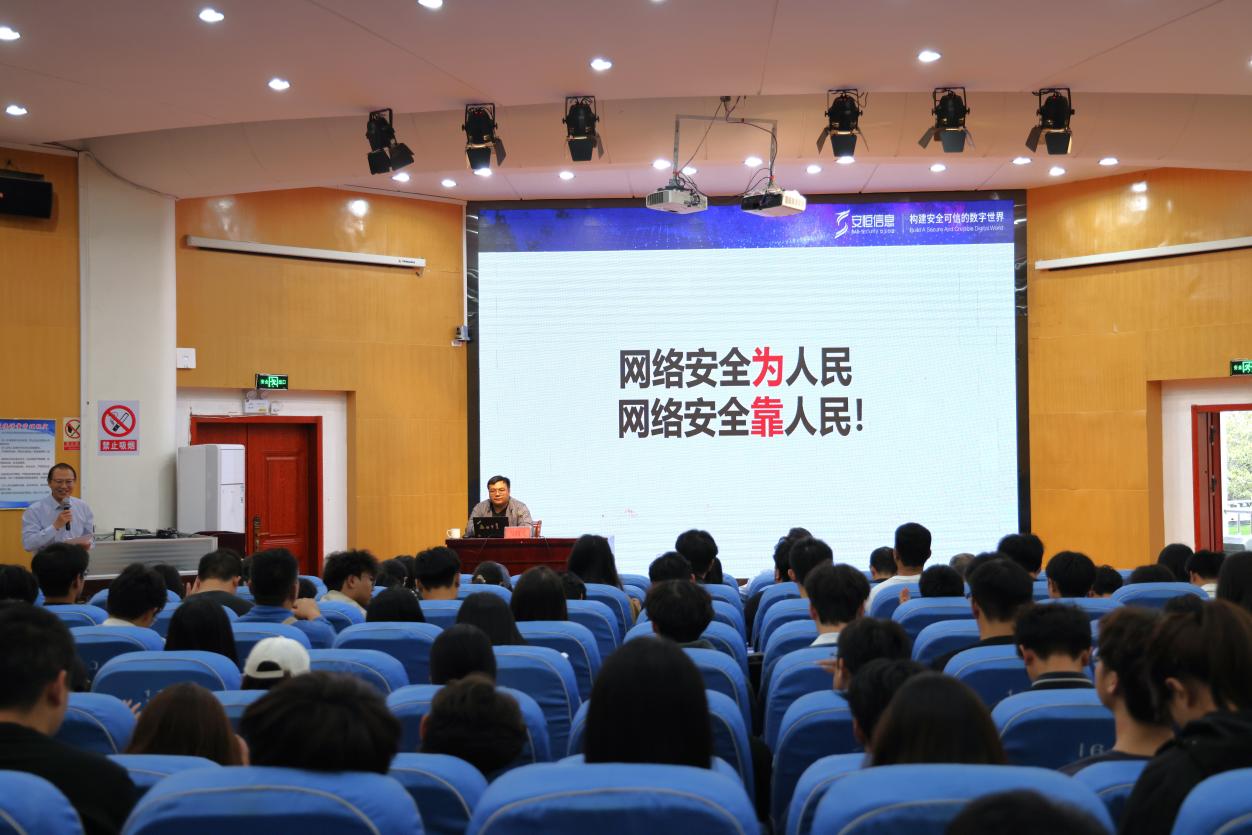 本网讯(学生记者/胡秋阳 韩华玺)9月17日下午,杭州安恒信息公司服务总监马腾飞受邀在我校领创空间第二报告厅开展网络安全意识培训,这是学校开展国家网络安全宣传周活动系列活动之一。校党委副书记、工会主席董豪出席,党委宣传部负责同志主持,信息化建设与管理服务中心全体人员,各学院分管领导、学生代表、网站与新媒体管理员等共同参加。