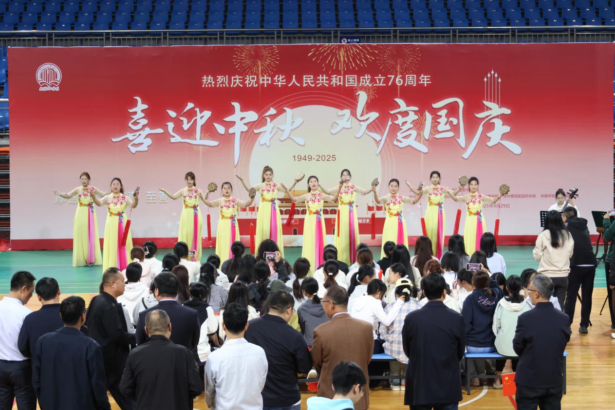 上午9时30分,文艺演出在东南校区体育馆二楼拉开帷幕。诗朗诵《月光下的中国》深情演绎家国情怀;河南大调曲子《唱南阳》展现地方文化的独特韵味;非遗板头曲《曲水流觞》的典雅演奏,更是赢得阵阵掌声。教师教育学院张宁老师带来的女声独唱《灯火里的中国》,将现场气氛推向高潮,歌声中传递出对祖国繁荣昌盛的美好祝愿。