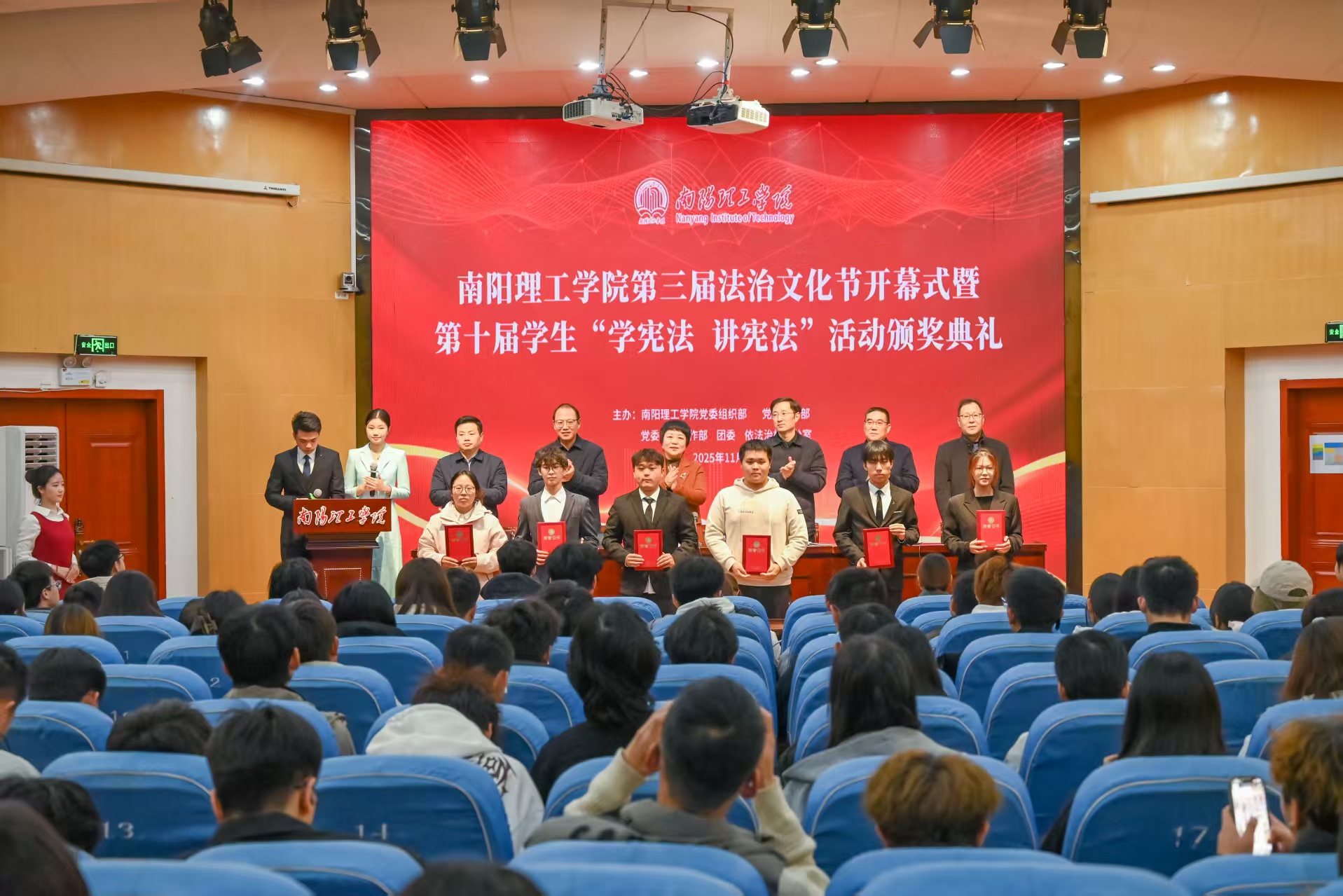 参会相关部门负责人为第十届“学宪法 讲宪法”活动获奖学生代表颁发荣誉证书。对在第十届学生“学宪法 讲宪法”演讲比赛、法治素养竞赛、法治情景剧比赛中表现突出的优秀学生予以表彰,树立典型、表彰先进,推动我校宪法宣传工作取得更大进步。