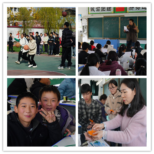 活动现场,董豪代表学校向老城镇初级中学捐赠篮球、羽毛球、跳绳等体育器材,为孩子们开展体育活动提供坚实物资支持。随后,党外知识分子代表们结合专业优势,带来一系列生动有趣的课程,刘靖靖老师引导孩子们用扭扭棒制作“向阳花”,王侃老师带领孩子们合唱《大刀进行曲》,邢洺祎老师组织孩子们进行“接力运球”游戏。
