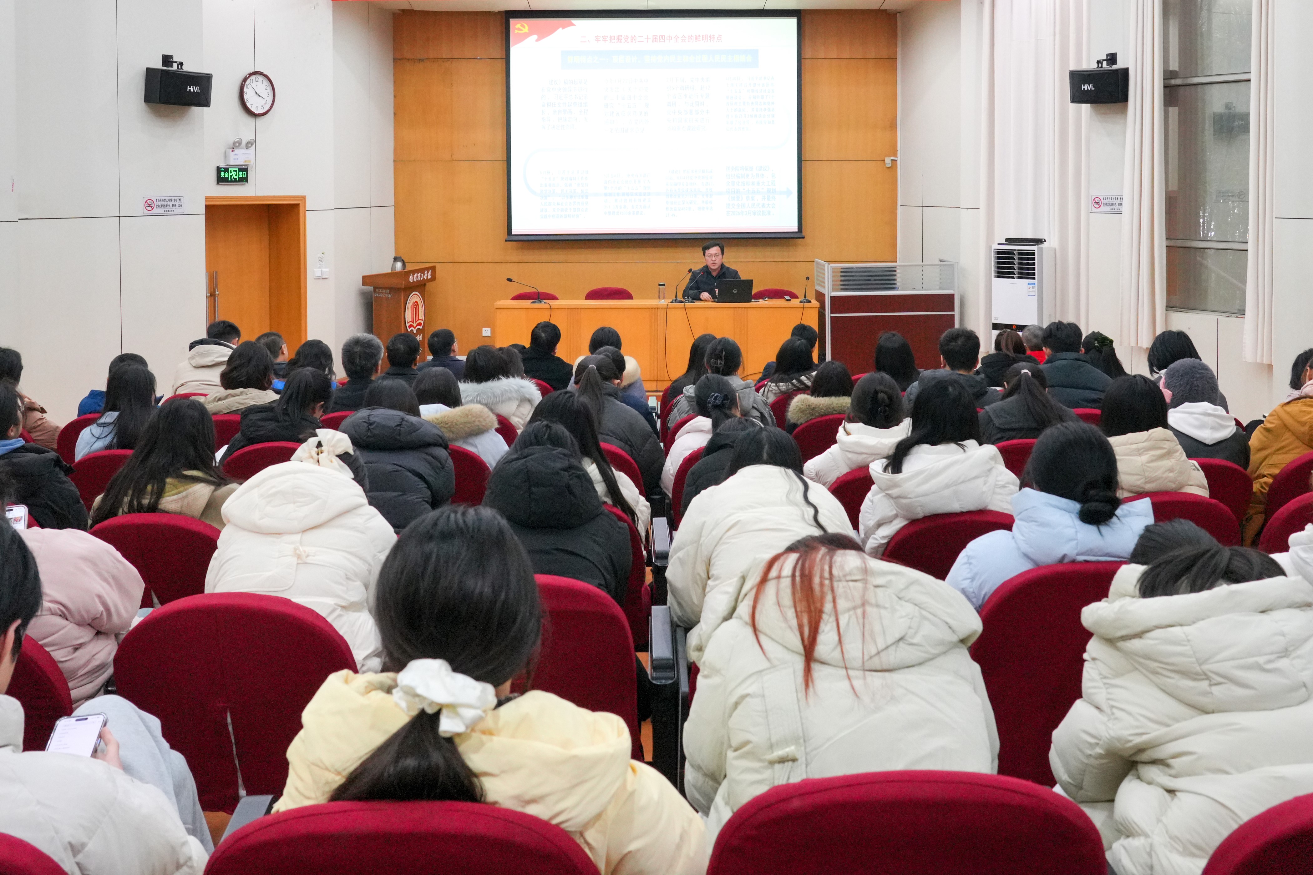 吴战勇以《在接续奋斗中谱写中国式现代化新篇章——深入学习贯彻党的二十届四中全会精神》为题,围绕党的二十届四中全会召开的时代背景和重大意义展开。他指出,党的二十届四中全会是在“十四五”规划即将收官、“十五五”规划即将启幕的关键时刻召开的一次重要会议,为中国式现代化发展承前启后,为中国中长期发展定向导航,为世界发展注入积极因素。全会不仅是擘画中国未来五年发展蓝图的关键会议,更在战略导向、发展理念、风险意识和沟通模式上展现出显著的新特点。围绕全会主要内容,他系统梳理了《中共中央关于制定国民经济和社会发展第十五个五年规划的建议》的总体结构,重点阐释了“六大原则、七个主要目标、十二项重大战略部署”的内在逻辑。他强调,要深刻把握坚持党的全面领导、坚持人民至上、坚持有效市场和有为政府相结合等重要原则,准确理解高质量发展、科技自立自强、人民生活品质提升和国家安全屏障更加巩固等目标要求,把学习成果转化为推动学院事业高质量发展的实际行动。