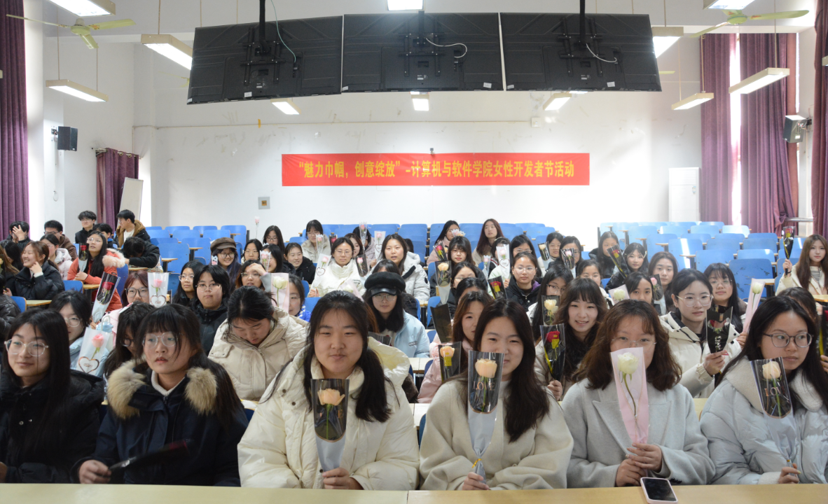 系列活动以主题讲座拉开帷幕,主持人代表学院向全体女性师生致以诚挚的节日问候与美好祝福。随后,学生代表登台分享自身成长经历,鼓励女同学们打破偏见、勇敢追逐科创梦想,同时结合行业内优秀女性开发者的鲜活案例,生动展现了女性在科技领域的卓越贡献与责任担当,引发在场师生的强烈共鸣与深刻思考。互动问答环节氛围热烈,同学们积极提问、交流心得,讲座尾声,工作人员为到场女生逐一送上玫瑰,以细腻之举传递温暖与敬意。