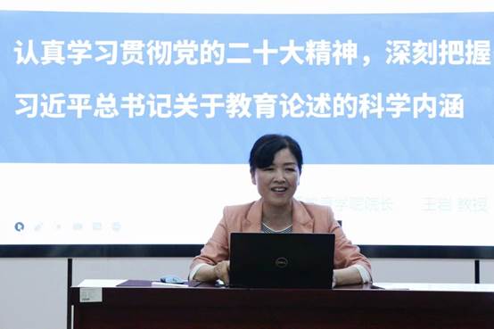 王岩以“党的二十大报告中关于教育的新提法”为切入点,从坚持党对教育事业的全面领导、坚持把立德树人作为根本任务、坚持优先发展教育事业等九个方面讲解习近平总书记关于教育的重要论述的科学内涵。她从党对教育规律的认识、新时代中国教育发展和世界教育发展路径等角度,让同学们深刻学习习近平总书记关于教育的重要论述的战略意义。她勉励同学们要有理想、有担当,在磨砺中挥洒青春的汗水,争取成为一名合格的人民教师。