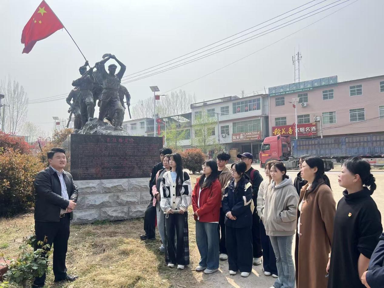 绿水青山间,伫立着“红二十五军英雄群像”“军民情深堆粮路”等红色雕塑,红色精神传承和绿色生态发展在这里汇聚,呈现出红绿交相辉映的山乡壮美景象。师生们驻足红二十五军长征路纪念碑前,认真聆听王镇长讲述革命历史,重温“两张席面”和“堆粮路”故事。在场师生重走长征路,接受了一堂生动的红色思政教育。