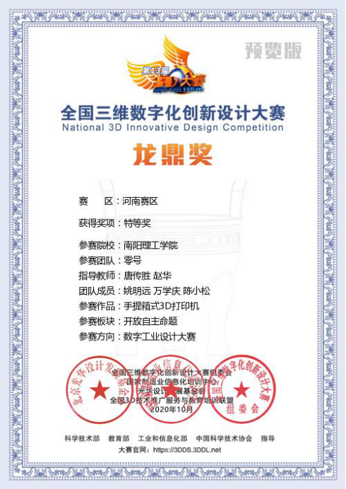 智能制造学院3个团队在唐传胜、朱磊、赵华三位教师的指导下,从河南省240余个参赛团队中脱颖而出,荣获特等奖1项、二等奖2项,将代表河南省参加全国总决赛。其中姚明远、万学庆、陈小松同学的“手提箱式3D打印机”作品在大学生组数字工业设计大赛方向荣获特等奖。
