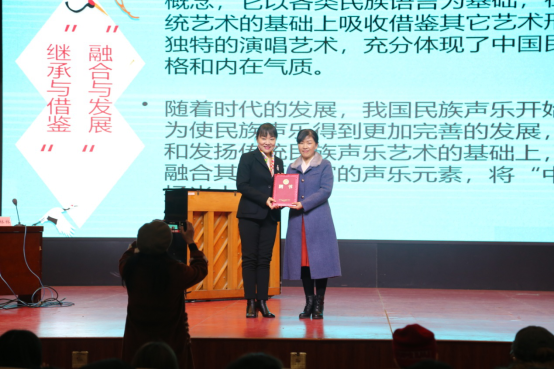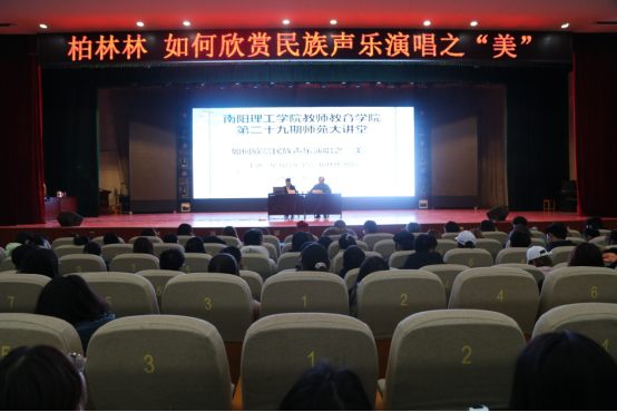 柏林林以《如何欣赏民族声乐演唱之“美”》为主题,从“声美”、“情真”、“腔韵美”、“形体美”、“语言美”、“意境美”等几个方面,阐述民族声乐演唱艺术之“美”的具体表现。她指出,民族声乐艺术是通过演唱形态进行,有效的演唱要正确使用“人体声音乐器”,注意演唱技巧和科学的发声方法。柏林林还特别邀请声乐专业同学上台演唱,并一一分析点评,针对出现的问题进行详细的讲解和指导。