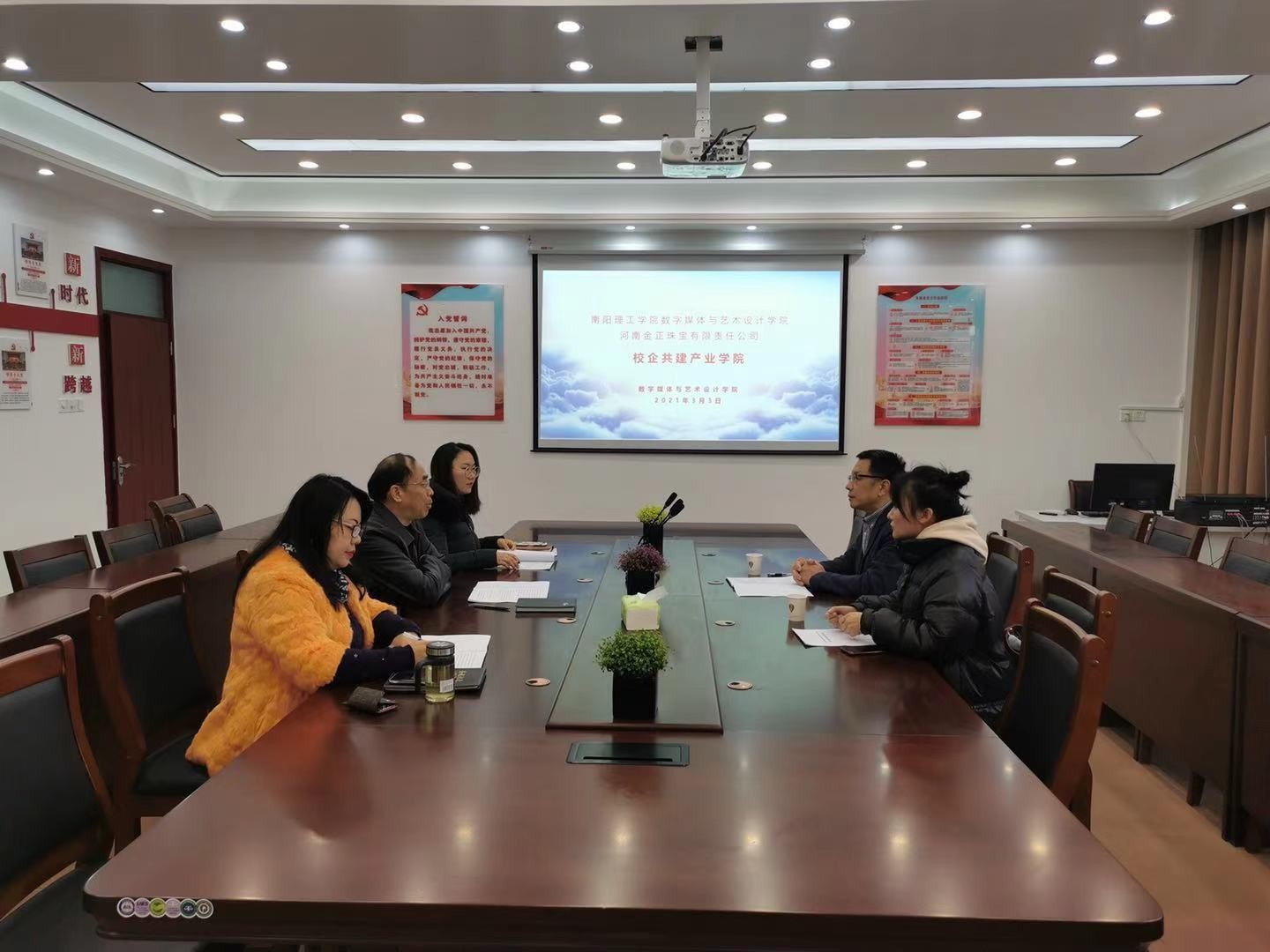 本网讯(特约记者/宋弘)3月3日上午,河南金正珠宝有限责任公司与数字媒体与艺术设计学院合作共建产业学院洽谈会在我院举行。河南金正珠宝有限责任公司董事长华文海、线上事业部经理段潇博,学院领导薛庆吉等人参加本次会议。