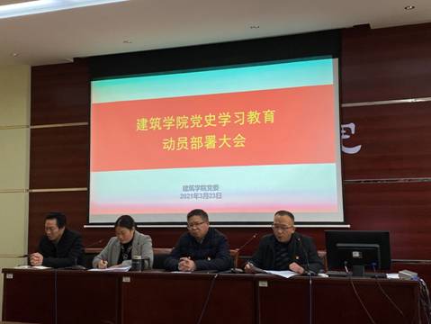 本网讯(特约记者/杨菲 田真)3月23日下午,建筑学院召开党史学习教育动员部署大会。学院领导班子出席会议,学院党委书记田光辉做动员讲话,全体师生党员参加会议。