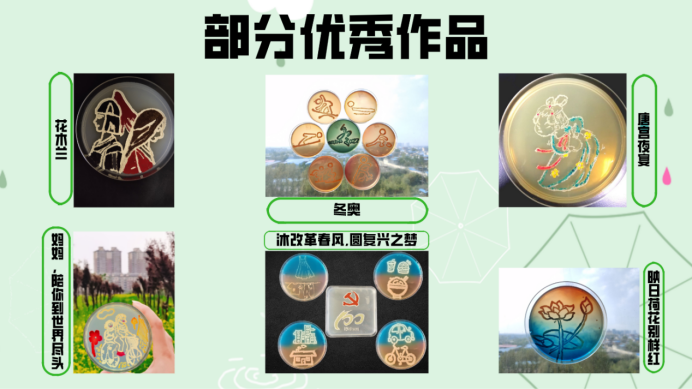 本次大赛共收集109幅作品,其中25幅作品入围决赛、参与答辩。25个团队代表依次上台,分别从灵感来源、材料选取、制作过程、作品寓意、成果展示等方面进行详细介绍。小小的培养皿中是生命的色彩与艺术的碰撞交织而成的美丽画卷,从充满自然气息的“挡雨”到令人惊艳的戏曲文化“国潮”,从繁复精美的“凤凰涅槃”到民间艺术“舞狮”,从山河壮美的“江山如此多娇”到满腹爱国心的“沐改革春风,圆复兴之梦”,一幅幅奇妙的微生物画作被展于眼前。评委从整体构型,色彩搭配,做工处理,展示表达四方面予以评分,对作品的细节进行提问并提出修改建议。