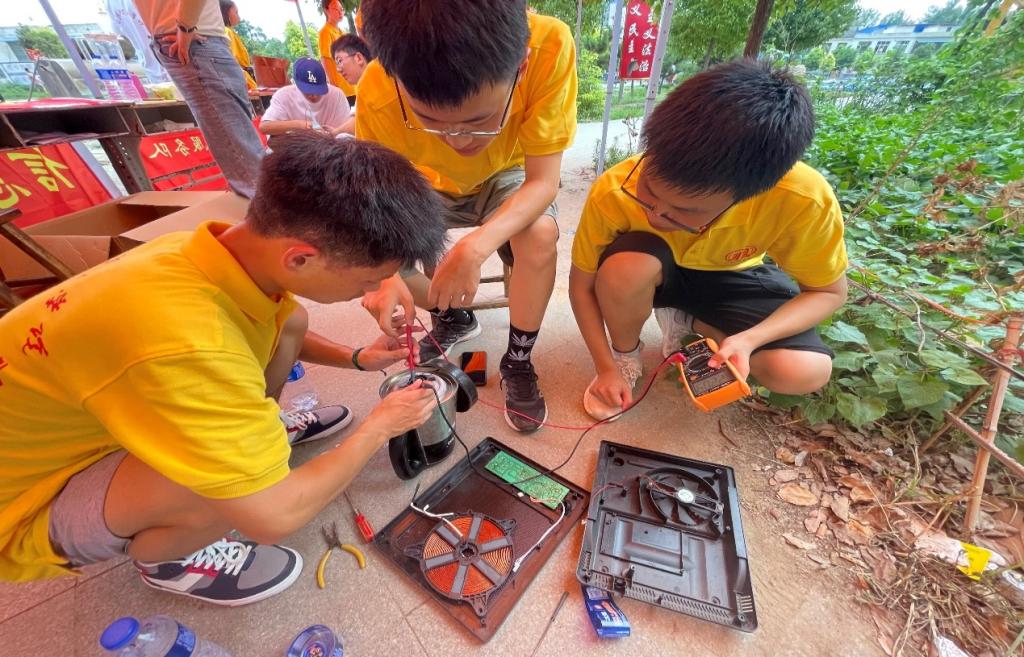 志愿服务队同学们分工协作,一组负责维修家电,一组向镇上居民发放宣传单并在当地生活群里进行夏季用电安全知识宣传。同学们不畏酷暑、耐心细致,活动三天内,现场共修理热水壶、电风扇、电磁炉等小家电三十余件,此次活动得到当地居民的一致肯定。