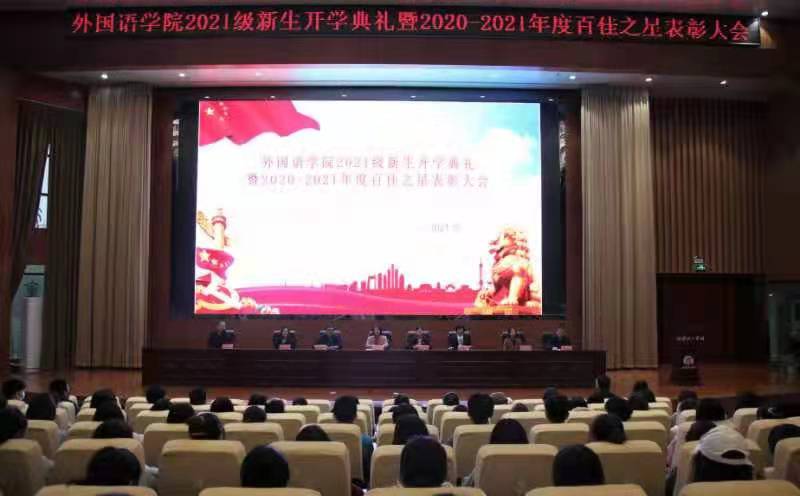 本网讯(特约记者/李鹏飞 学生记者/马豪静)10月16日,外国语学院举办2021级新生开学典礼暨2020-2021年度百佳之星表彰大会。学院领导班子出席大会。
